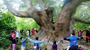 sombra de plátano de tupido follaje sobre los niños